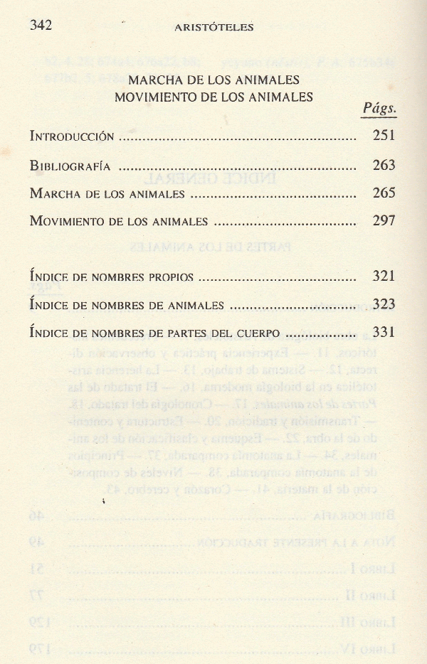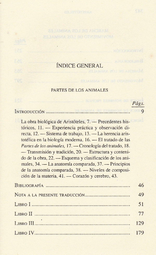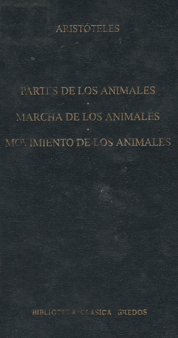 Traducción de tres tratados aristotélicos fundantes de las hoy conocidas ciencias biológica y zoológica. Los temas que se tratan son amplios y minuciosos, se relacionan principalmente con la teoría etiológica del Estagirita, principalmente la teoría teleológica de la naturaleza, a partir de la cual se clasifican los animales y se estudian sus diferentes partes; miembros, órganos, características geográficas, etc. Entre otras cosas, se plantea la importancia de estos estudios en paralelo con los estudios de astronomía, apelando al conocimiento empírico y su importancia para el pensamiento filosófico.