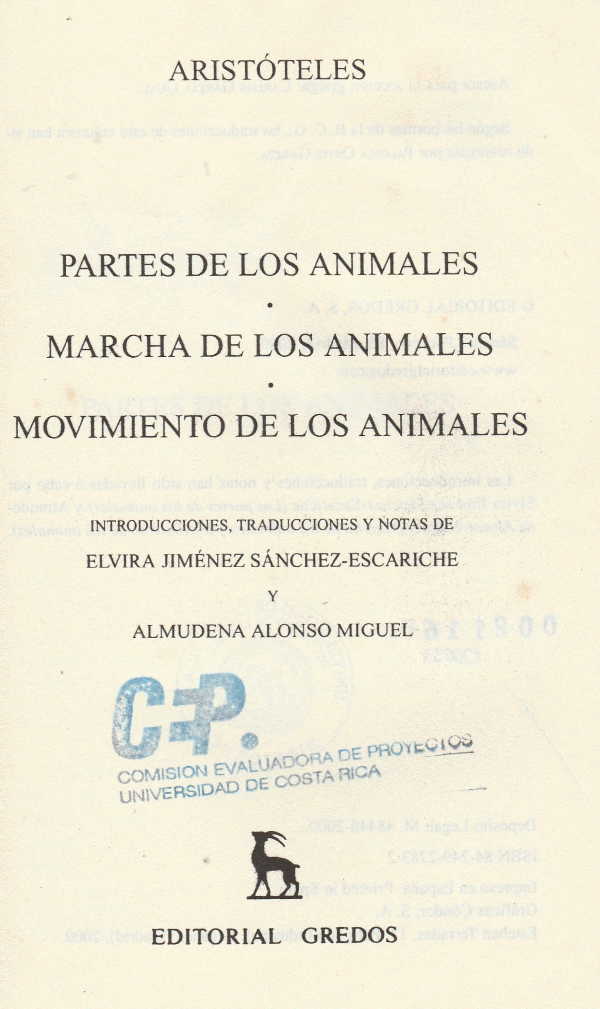 Partes de los animales. Marcha de los animales. Movimiento de los animales / Aristóteles ;